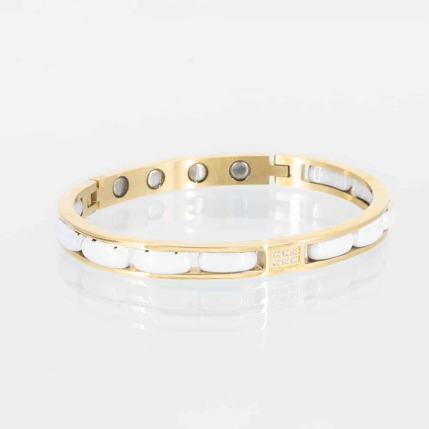 Dieser wunderschöne Armreif besteht aus weißer Ceramik, eingefasst in einem Edelstahlreif mit einer goldenen Ionenplattierung. Der Armreif lässt sich öffnen.