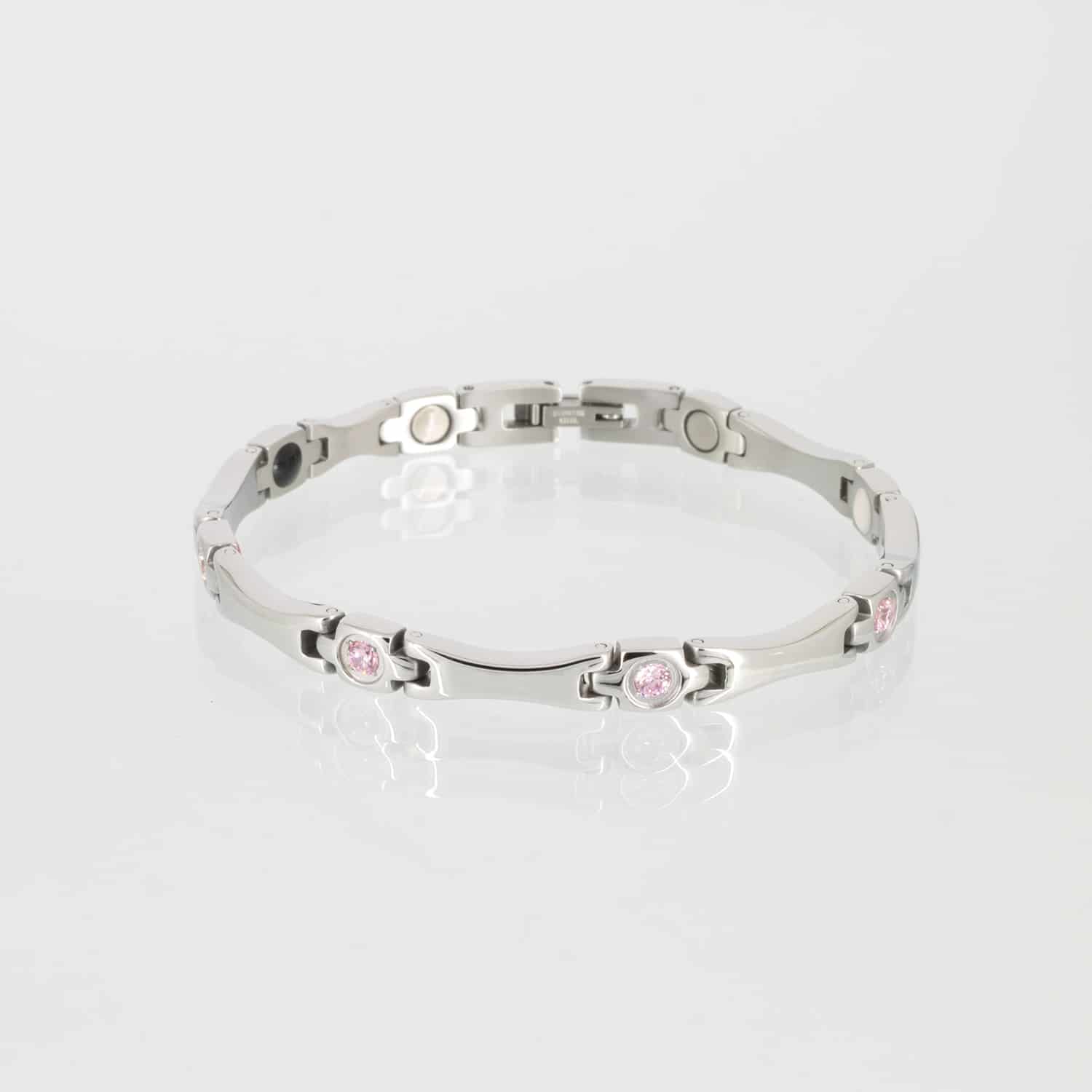 Ein sehr feines Energiearmband aus medizinischem Edelstahl. Die rosafarbenen Zirkoniasteine verleihen ihm einen ganz besonderen Charme.