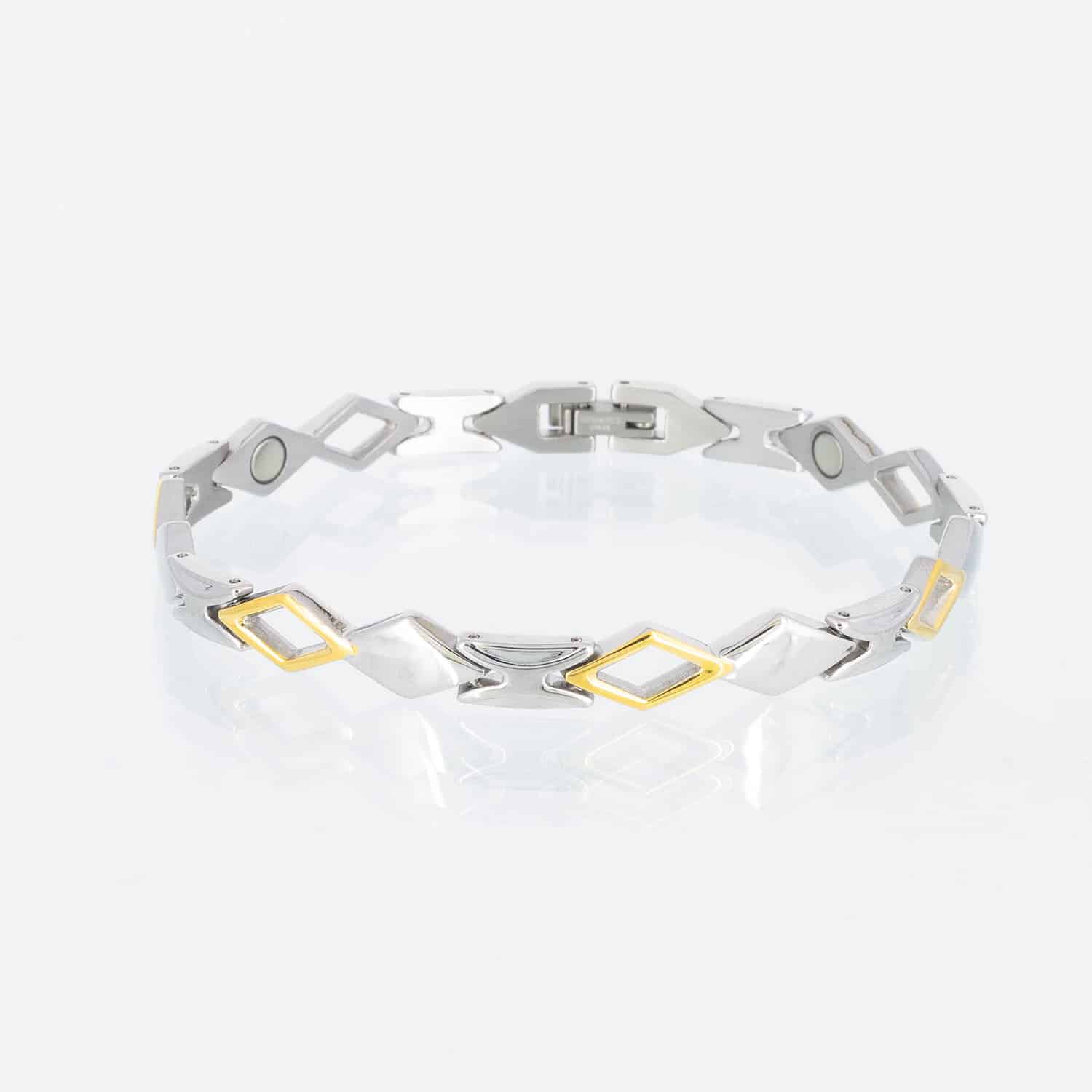 Ein wunderschönes lebendiges Magnetarmband aus Edelstahl. Es ist glänzend poliert und enthält teilweise eine goldene Ionenplattierung.